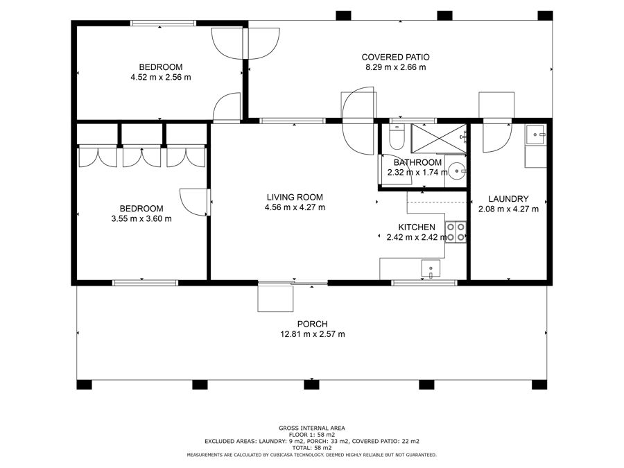 The rear patio traverses ¾ the length of the home whilst the front covers the entirety.